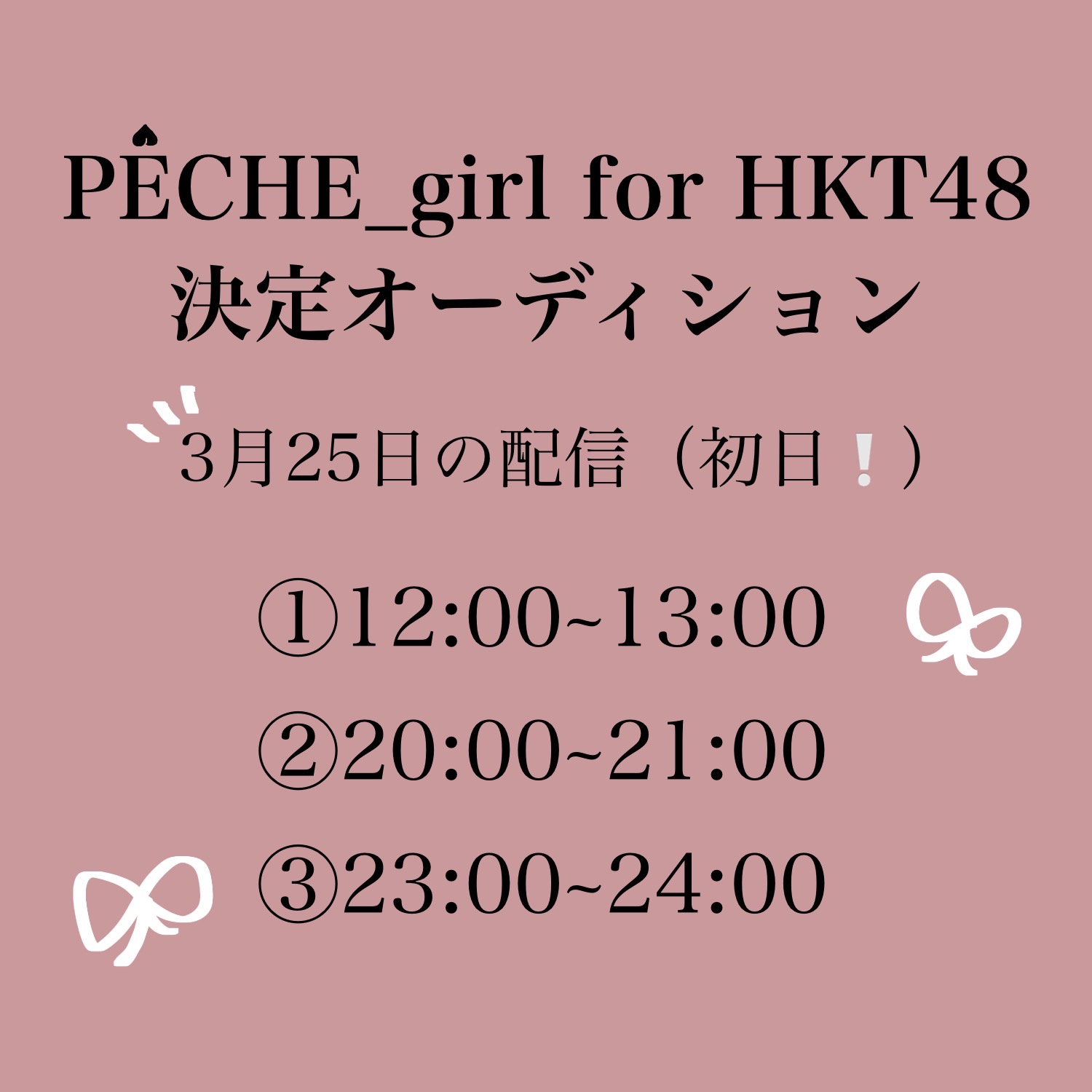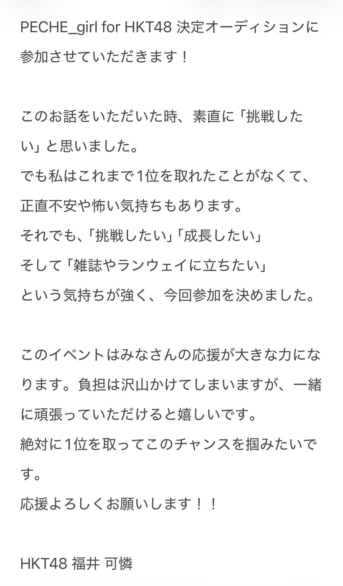 『PECHE_girl for HKT48 決定オーディション』参加させていただきます!🍑期間は3月25日12:00〜3月31日19:59までの1週間となっています。ぜひ応援してくださったら嬉しいです!!https://www.showroom-live.com/r/48_KAREN_FUKUI?t=1774356958