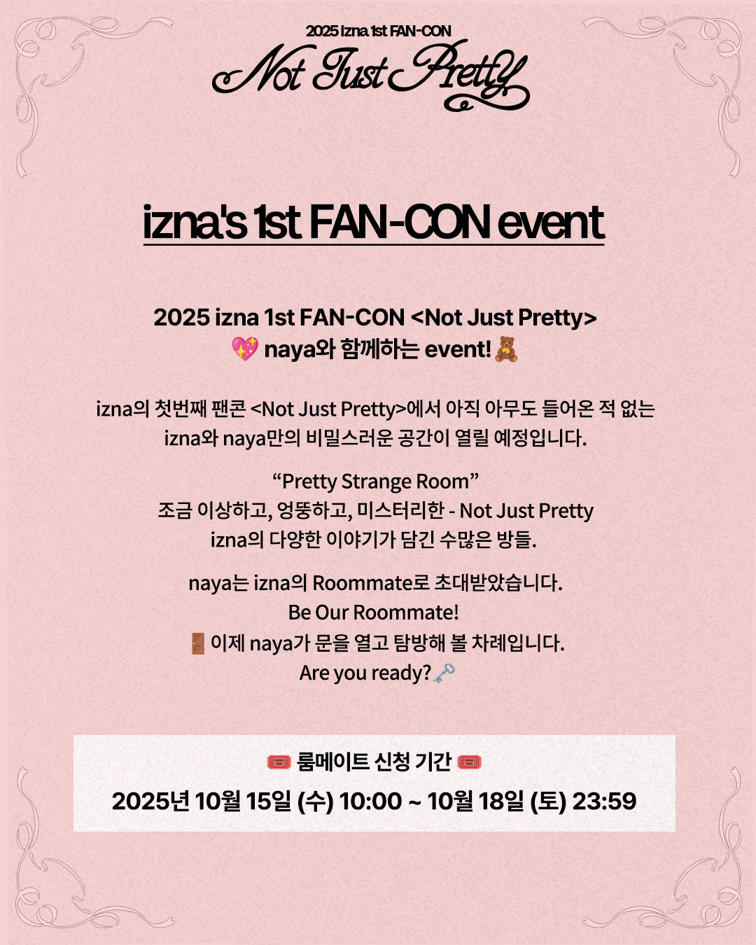 2025 izna 1st FAN-CON <Not Just Pretty> EVENTBe Our Roommate!📌 룸메이트 신청 하기🗓️ 2025.10.15 (WED) 10:00 - 2025.10.18 (SAT) 23:59🔗 https://forms.gle/xKutBBGcQpfJPTybA✅ 본 이벤트는 국내 FAN-CON 공연에 한해 운영됩니다.✅ 본 이벤트 참여를 위해서는 Google 계정 로그인이 필요합니다.