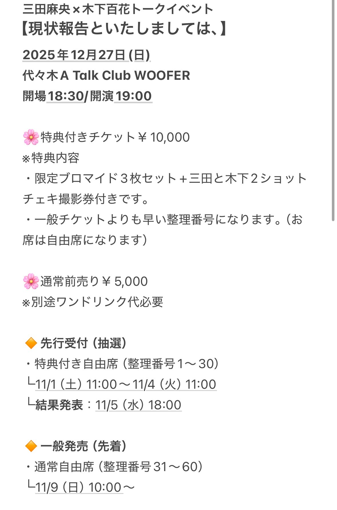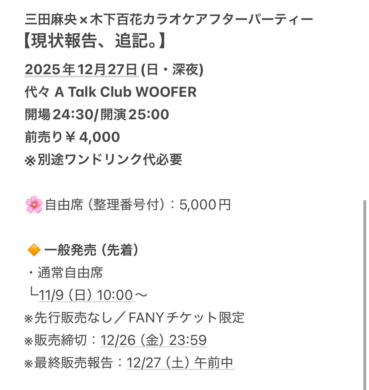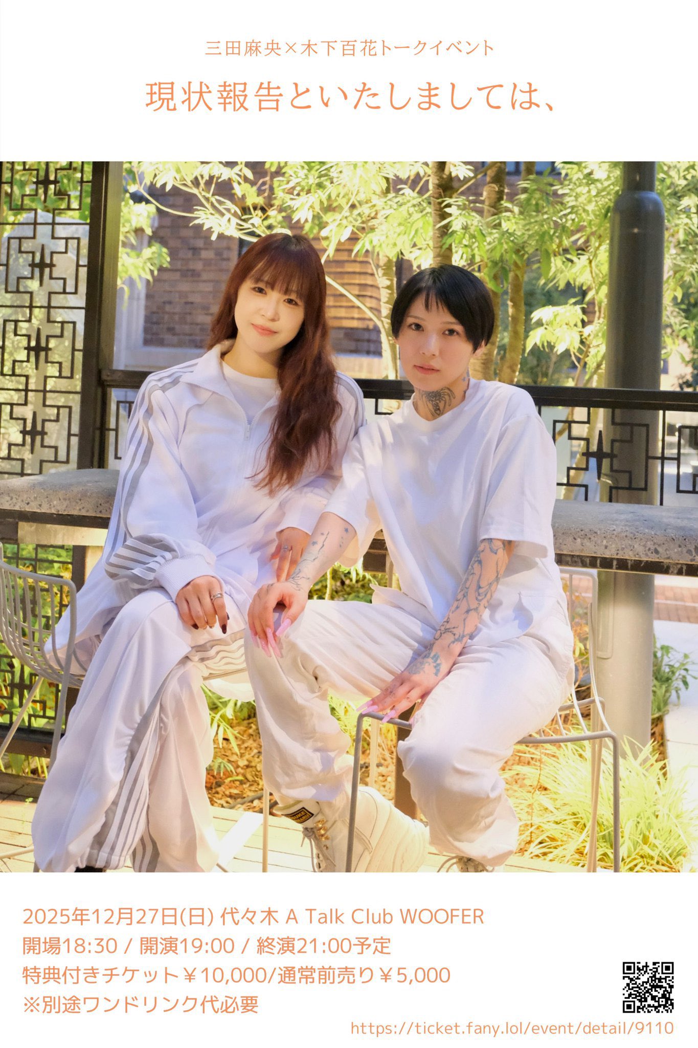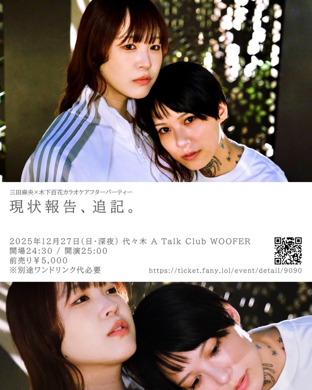 三田麻央×木下百花トークイベント【現状報告といたしましては、】2025年12月27日(土)代々木A Talk Club WOOFER開場18:30/開演19:00⸻三田麻央×木下百花カラオケアフターパーティー【現状報告、追記。】2025年12月27日(日・深夜)代々 A Talk Club WOOFER開場24:30/開演25:00